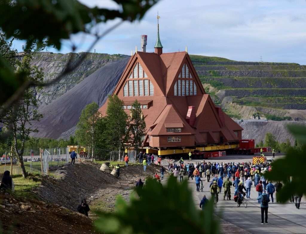 Vers les années 2000, Kiruna faisait face à un dilemme. Ou bien la mine continuait de s’étendre en-dessous de la ville, avec un risque d’effondrement sur le long terme, ou bien l’extraction de minerai devrait s’arrêter. La decision de déplacer les quartiers Ouest de la ville fut votée. Dans ces quartiers, la mairie, la gare et une église à l’architecture remarquable construite en 1912, entr’autres. Cette église Luthérienne est considérée par les Suédois comme un des plus beaux bâtiments historiques du pays. Une architecture en bois, très moderne pour son époque, et empreinte d’un héritage Lapon.